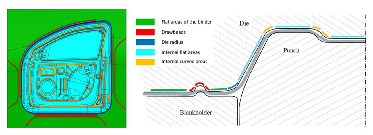 Figure 2 – Schematic representation of the main areas of the drawing tool and example of the division carried out for the steel inner door component