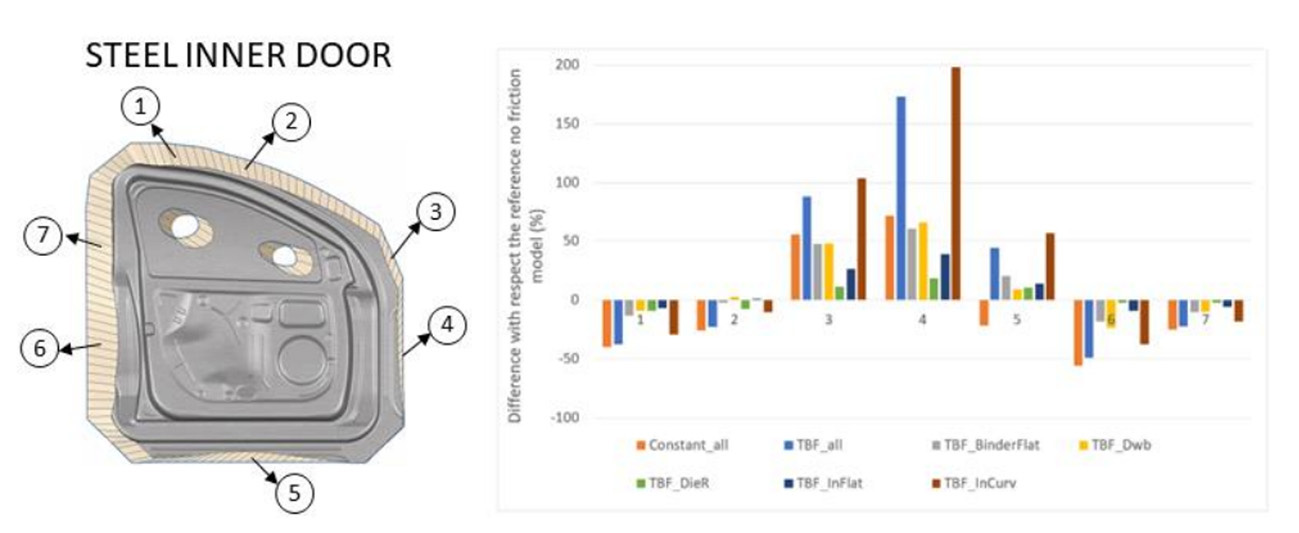 Figure 3 – Draw-in prediction for the steel inner door. On the left side, the draw-in field view under the reference case (no friction model). On the right side, the difference in draw-in is shown for each friction activated area.