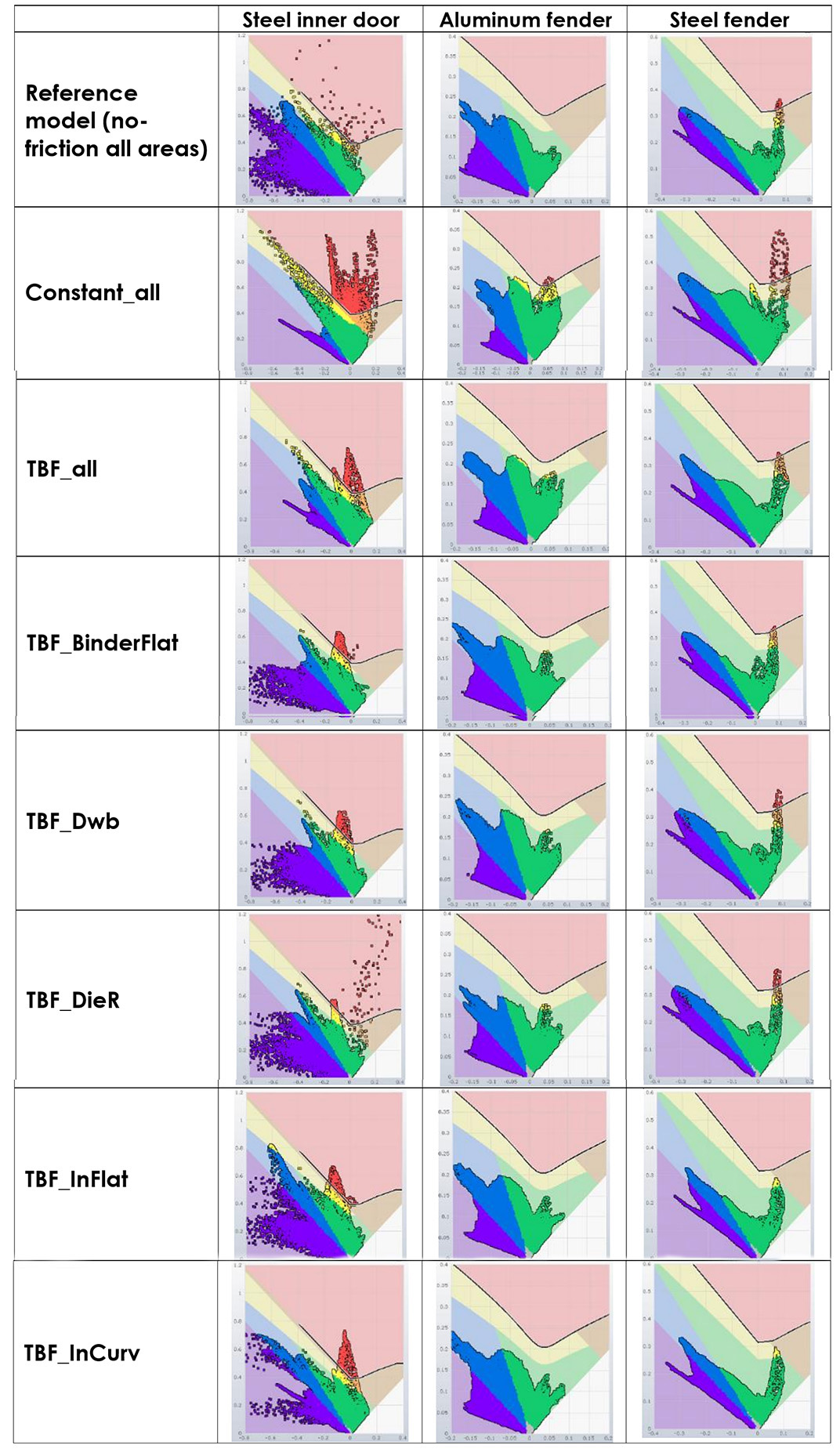 Seven simulation variants were run per component, ranging from frictionless conditions to friction applied individually in each zone, as well as full-tool friction models. By comparing these localized friction simulations with conventional constant Coulomb friction assumptions, the study revealed which tool regions are truly sensitive to friction effects, and which are not.
