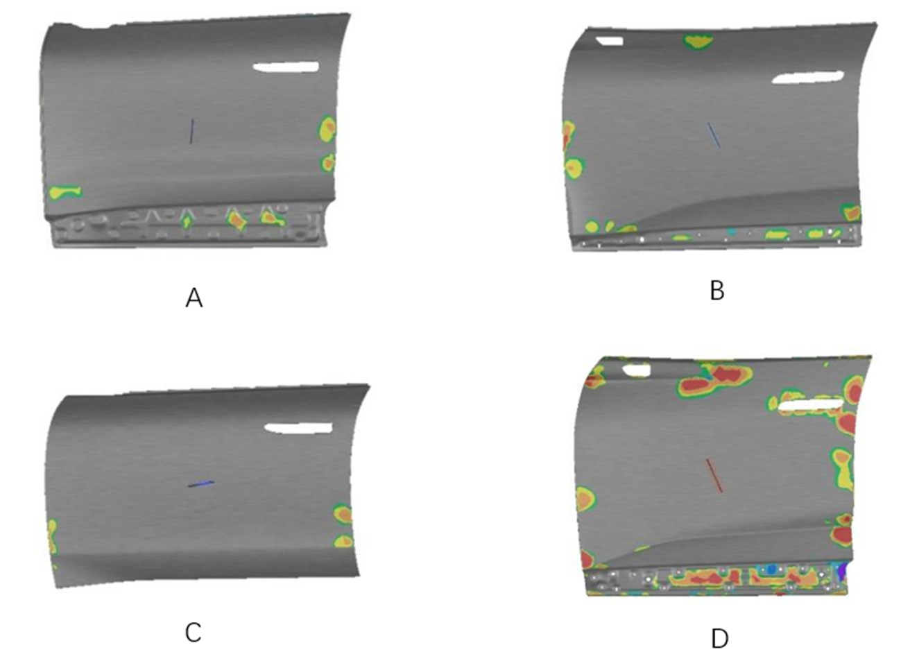 The stiffness analysis results for front door outer panels of different NIO vehicle models under flat support conditions are shown in Figure 2. As observed, the larger the red-orange-yellow zone (color gradient indicates severity), the more severe the deformation. Under gravity loading, areas with insufficient stiffness on the stamped front door outer panel are mainly distributed near the A-pillar and B-pillar on both sides. Due to its highly arched design, model B’s door panel exhibits better overall stiffness, whereas model D performs the worst, showing significant curvature changes under gravity and a higher risk of actual surface low—especially near the B-pillar. This qualitative stiffness evaluation will be verified in the subsequent quantitative pressing deformation simulation.