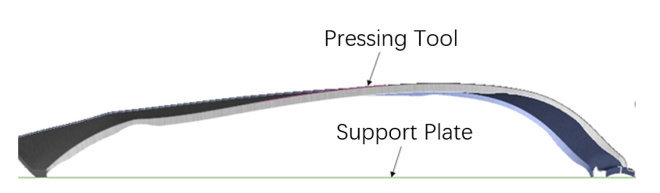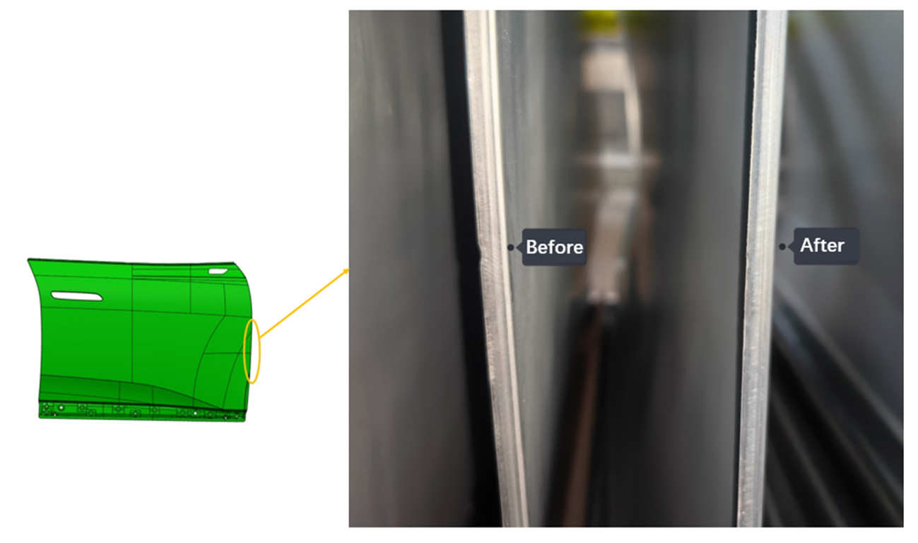 Under actual gravity conditions, the relatively low points at the four corners of the stamped outer panel come into contact with the supporting surface. If the panel’s stiffness is insufficient, the Class-A surface may exhibit defects such as surface low under gravity loading, directly affecting the part quality.