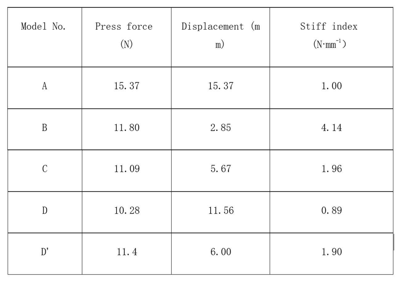 (2) In pressing deformation analysis, the ratio of pressing force to displacement (stiffness coefficient, N/mm) provides a quantitative index that accurately describes stiffness, consistent with gravity-based surface low results.