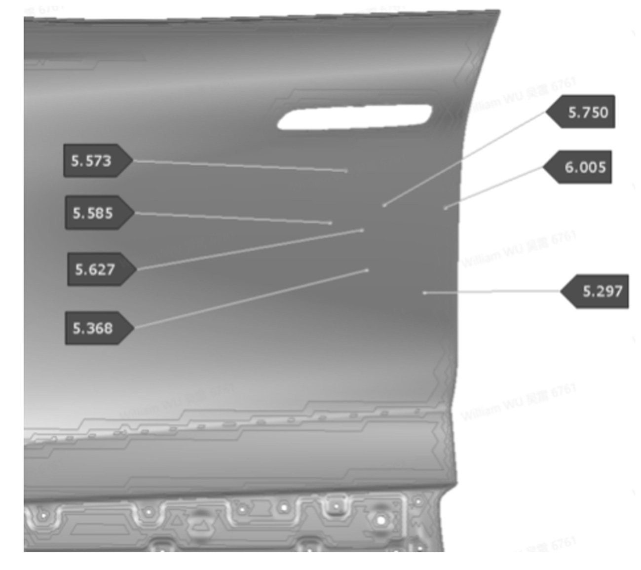 This study applies the self-positioning (locating) function in AutoForm’s measuring OP, using a flat plate as the support tool to analyze contour and shape changes of the front door outer panel under gravity. Elastic deformation and vibration within the material’s elastic range can partially reflect the stiffness of the stamped panel. Using the surface lows command, we can inspect the stoning and curvature result before and after gravity loading. In this way, stiffness-deficient areas can be qualitatively identified and their influence on part quality assessed. In theory, regions with lower stiffness exhibit greater curvature changes, while stiffer areas show minimal variation, resulting in less abrupt transitions in the stoning analysis. Figure 1 illustrates the gravity loading condition of the front door outer panel on a flat plate.